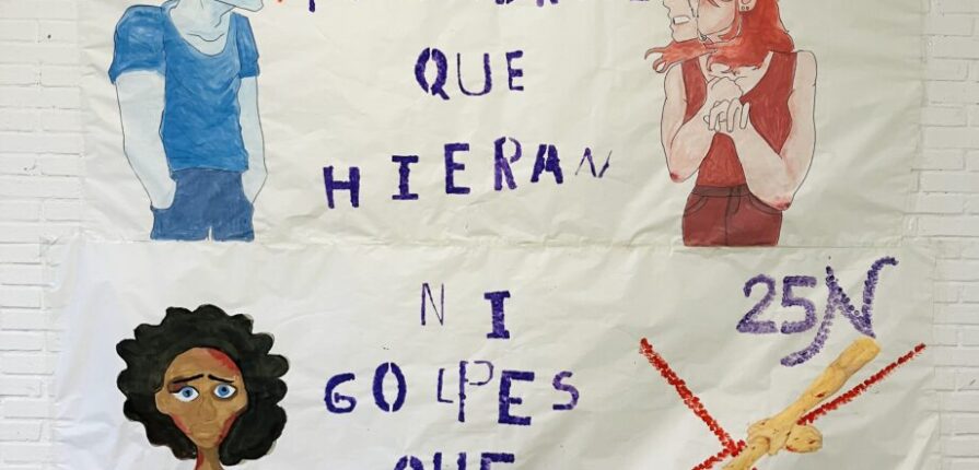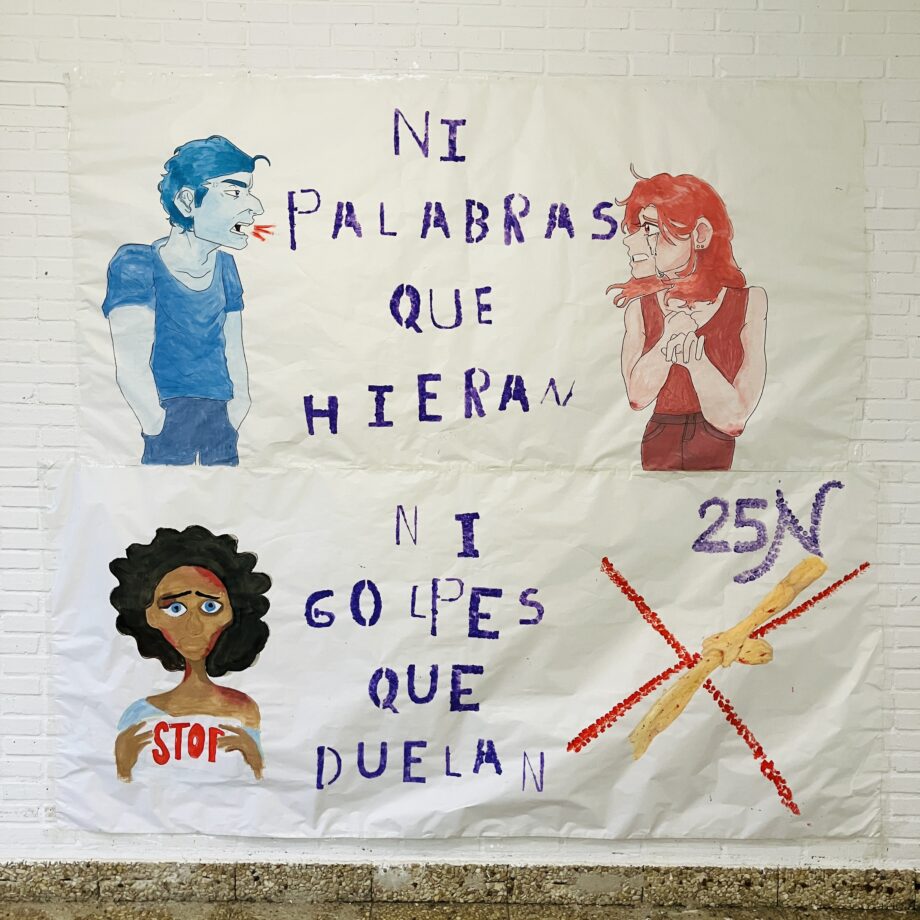 Con motivo del Día Internacional de la Eliminación de la Violencia contra la Mujer y dentro de la programación anual de nuestro plan de salud y trabajando en la línea de la salud emocional y la seguridad el alumnado de segundo de la ESO ha elaborado las imágenes de éste magnífico mural a acuarela con la colaboración de quinto de primaria en la realización de las letras con impresiones digitales.