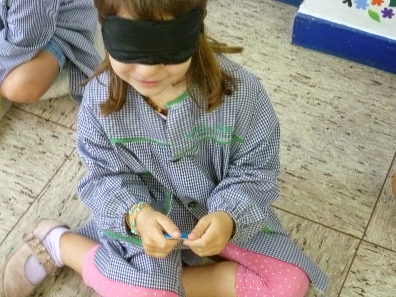 Ya sabemos que las formas geométricas están por todas partes y podemos ver y hemos observado cuantas cosas hay circulares, cuadradas, rectangulares…incluso ovaladas y en forma de rombo que son algo más difíciles. Para repasar lo que ya sabemos hemos jugado a un juego en el que, con los ojos cubiertos por un antifaz, debíamos de reconocer a través del tacto, de que forma se trataba y que vemos que tenga esa forma.